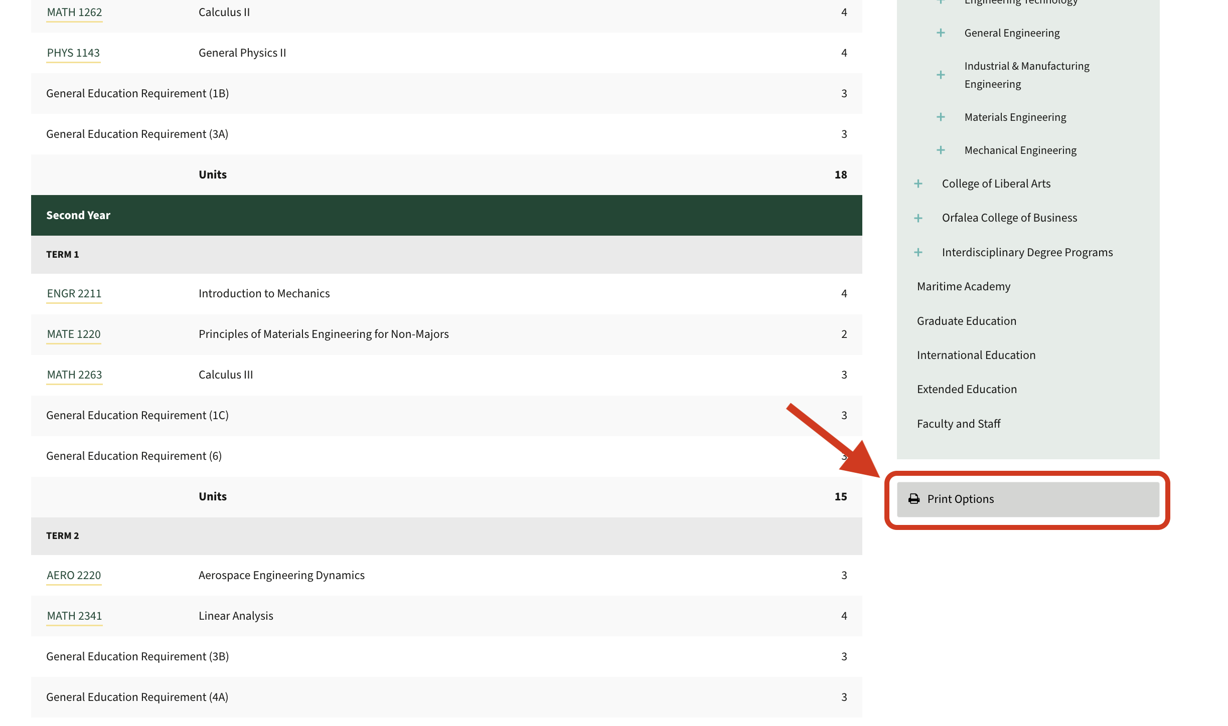 On the Requirements page scroll down until you reach the end of the sidebar on the right. Below click on "Print Options." This will open a pop up window.